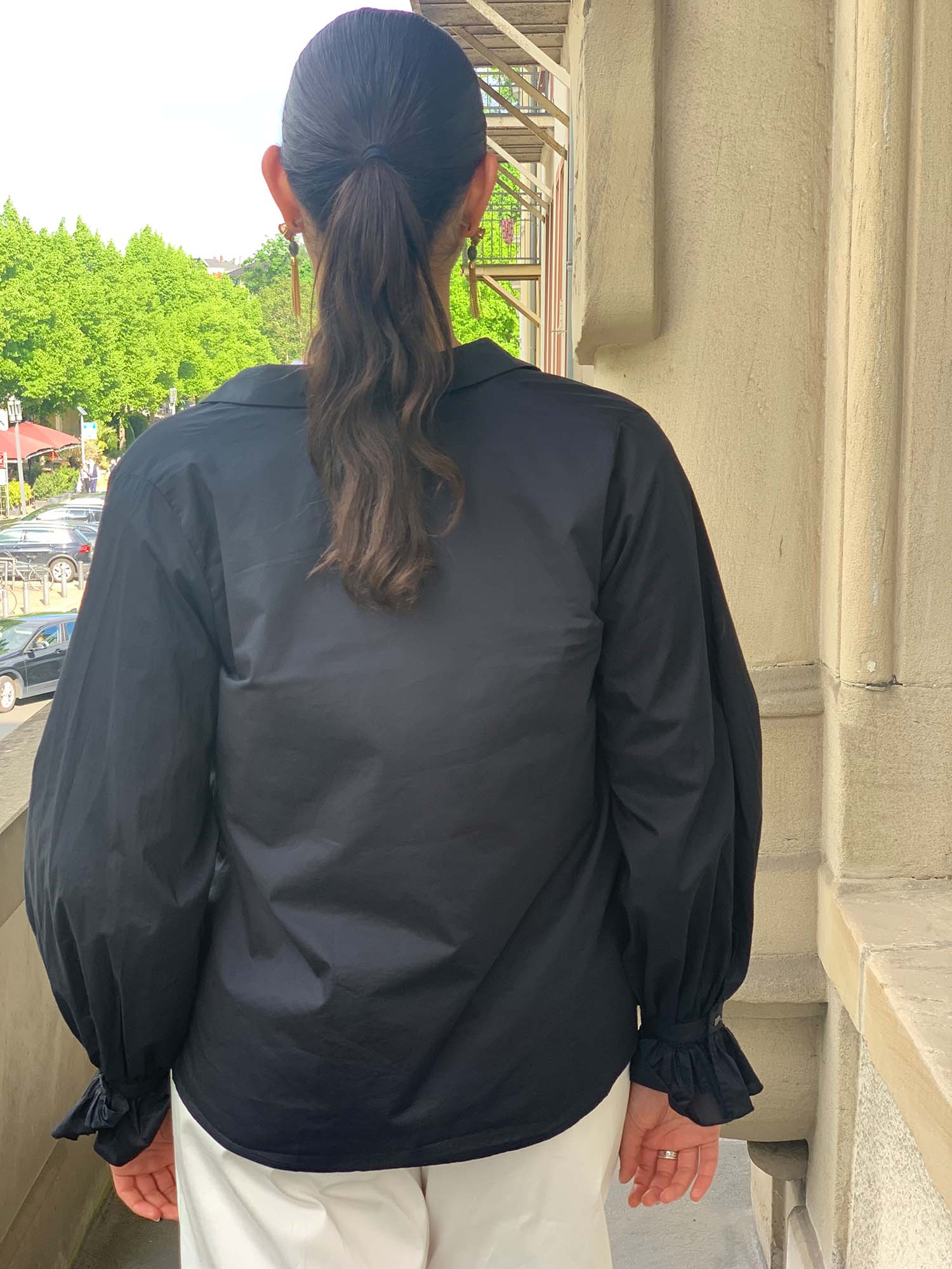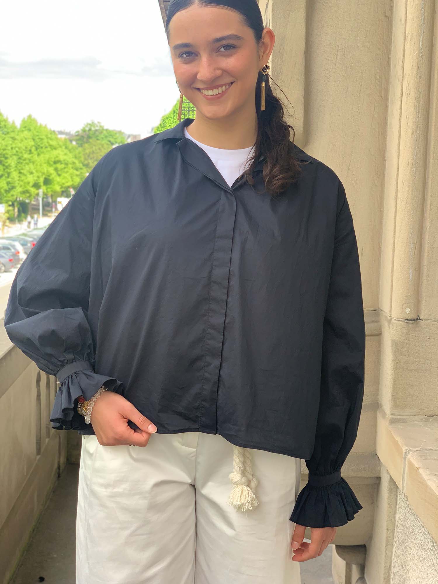 Fil Noir: Leichte Baumwollbluse in Mitternachtsblau, kleiner Kragen, durchgehende, verdeckte Knopfleise, lange, gebauschte Ärmel mit schmaler Manschette und anschließender Rüsche, extra weite und leicht ausgestellte Passform. Material: 100% Baumwolle