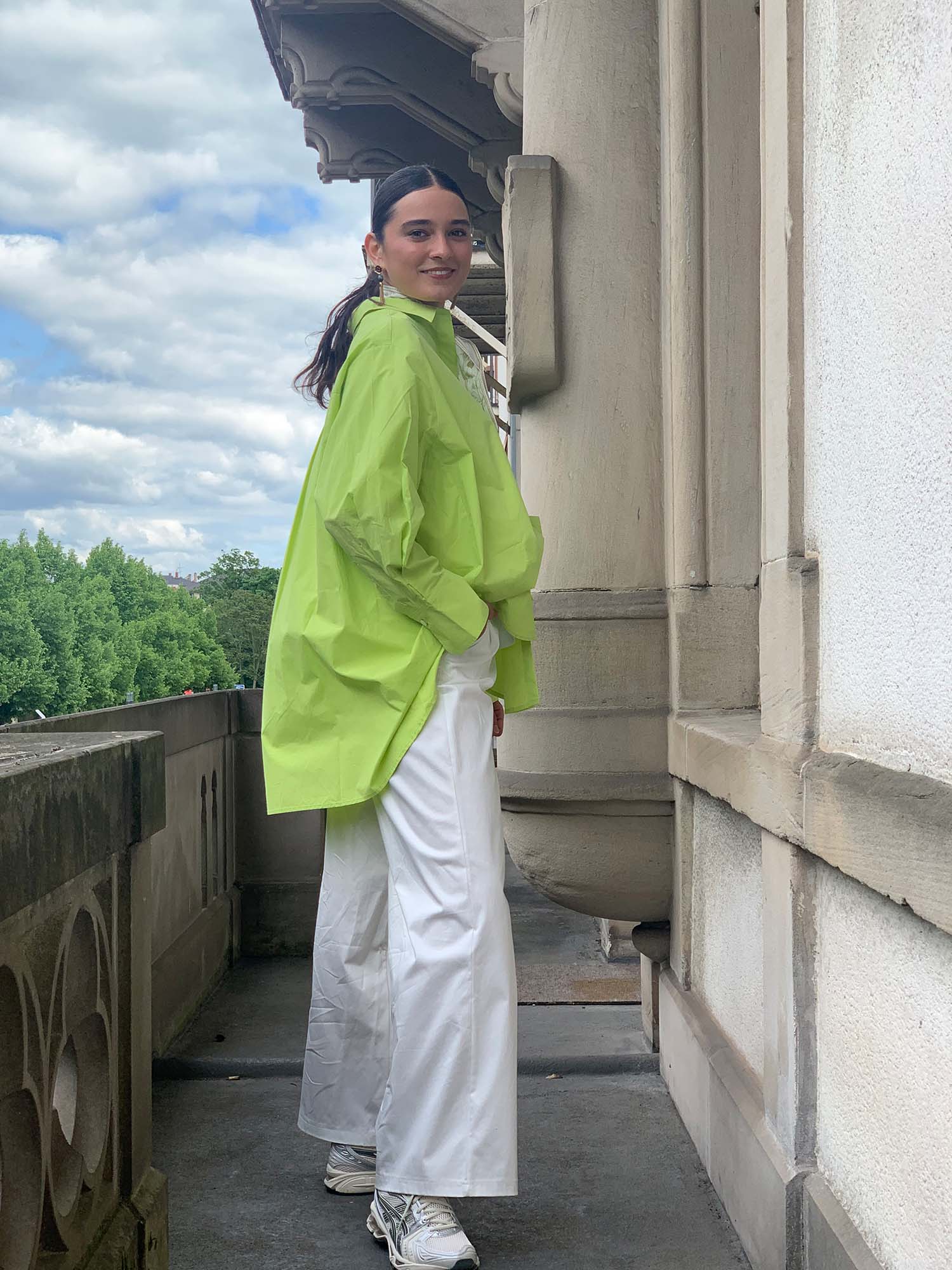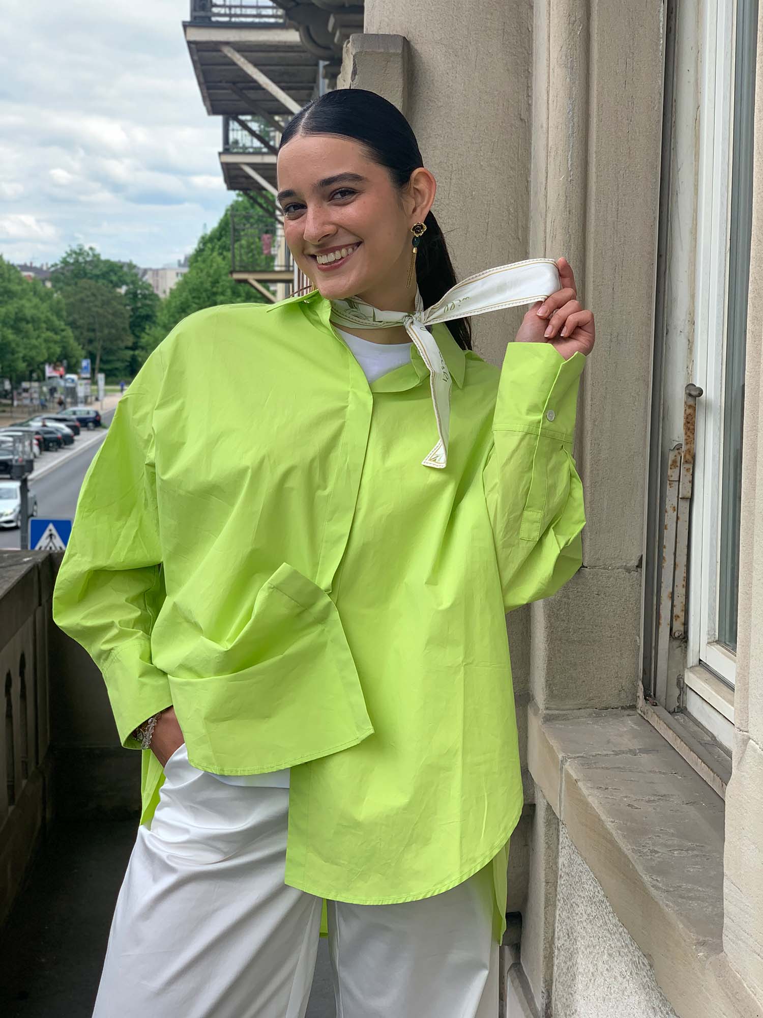 PDR Phisique du Role: Cooles Oversized Hemd in neongrün, verdeckte Knopfleiste, Hemdkragen, hinten länger. Material: 100% Baumwolle.